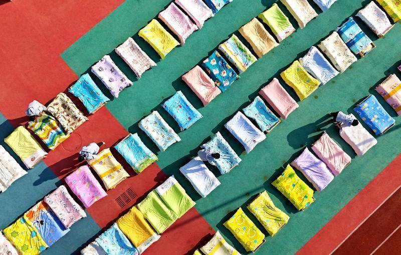 保育员曝晒的幼儿被褥成为校园里的一起靓丽表象。